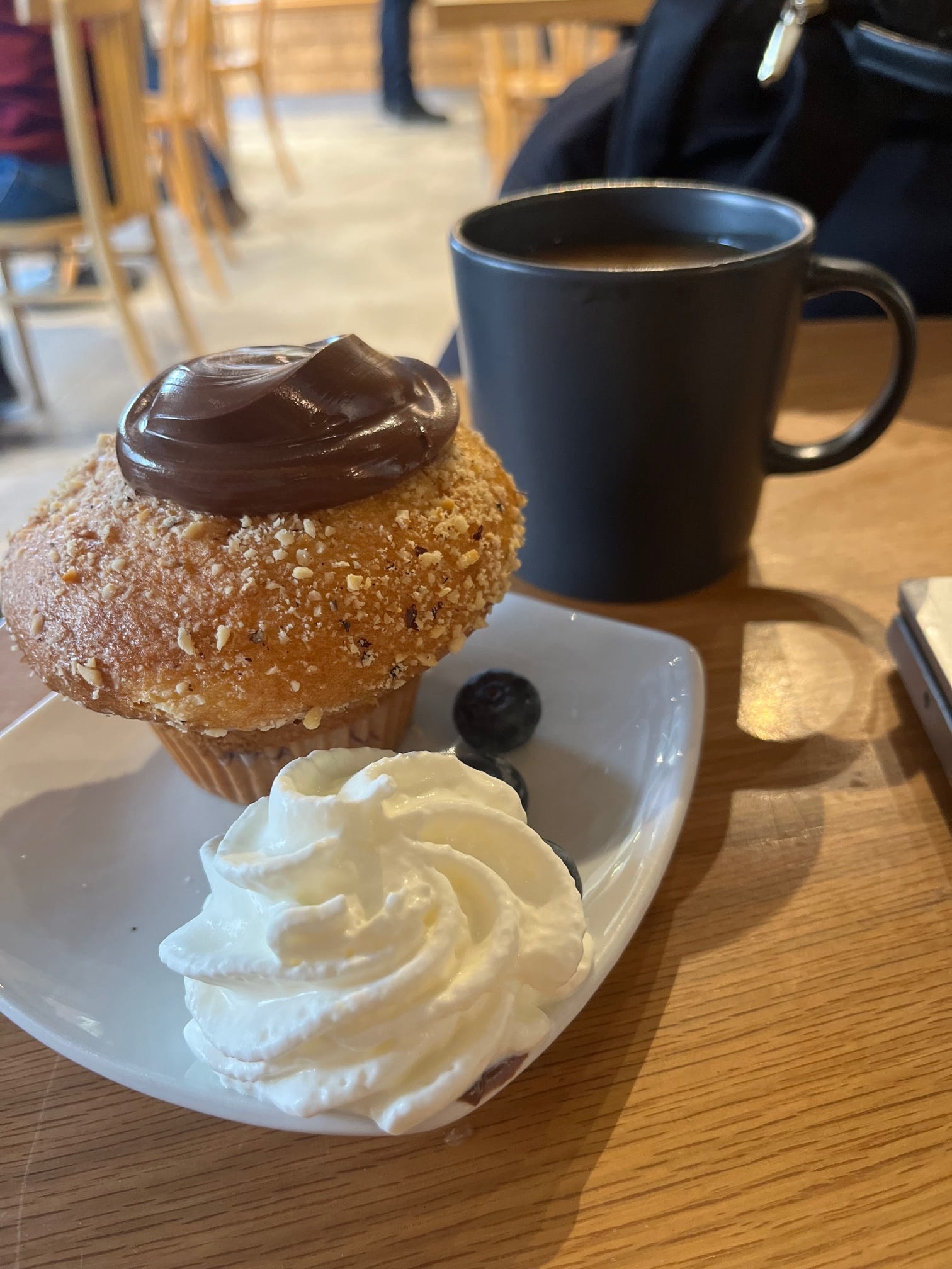 She decided to add extra Nutella on my muffin, some blueberries and whipped cream.